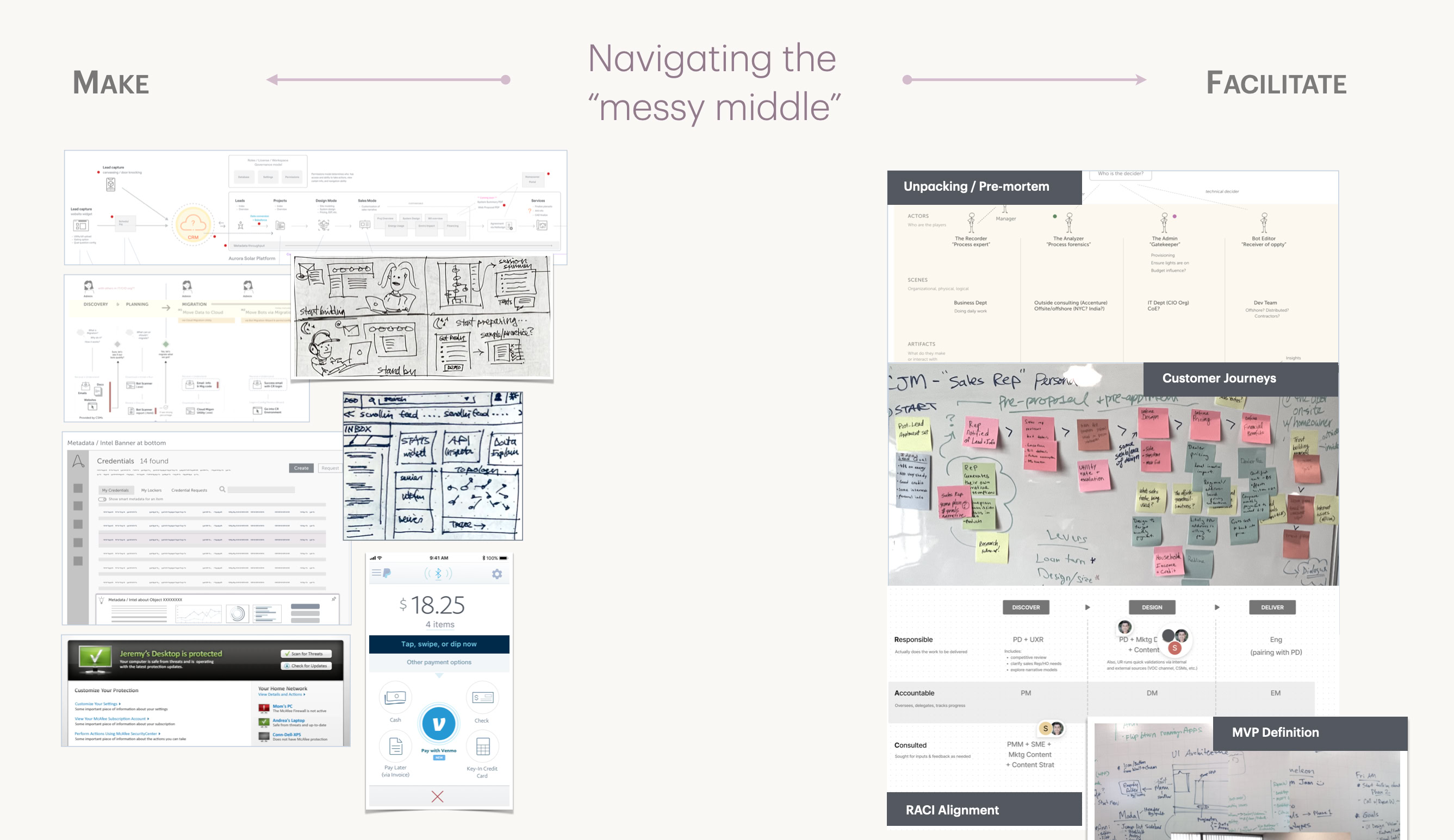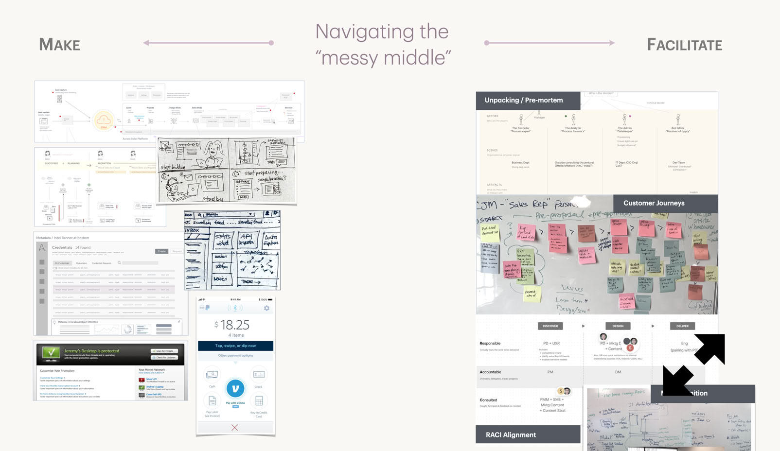My method is very simple — I make artifacts to probe a problem space or generate solutions, then I use them to facilitate structured cross-functional dialogues to move forward. With clarity. With shared purpose, not thrash.